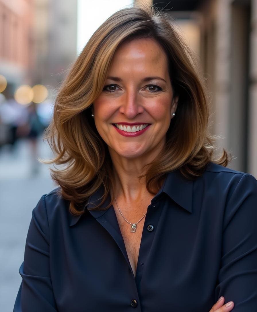 Smiling woman with brown hair outside building.